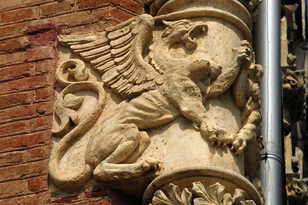 Lleó, tallat en fusta, a la porta d'una casa del raval de Santa Anna. Reu) Una espècie de lleó molt comuna en els bestiaris antics és l'alada. Aquest animal fabulós és del tot semblant, quant al cos, als seus parents terrestres, però és dotat d'unes ales semblants a les de l'àliga.