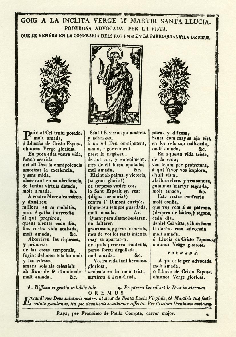 | Els goigs són composicions poètiques d'ús popular a lloança de Crist, de la Mare de Déu, d'un sant o d'una santa, fetes per ser cantades en les celebracions populars. És habitual que s'interpretin al final de l'ofici de la diada corresponent, o en un context de celebracions religioses, encara que també n'hem aplegat alguns emprats com a cant de treball. Es tracta d'un repertori recollit entre la transmissió oral i la documental. Efectivament, els textos solen trobar-se impressos en diferents èpoques, però al mateix temps la seva transmissió i, sobretot, la de la música són orals. Aquesta última no sol aparèixer massa sovint recollida en les edicions antigues. Aquests són alguns exemples de goigs dedicats a santa Llúcia, procedents de la col·lecció de Joan Roig i Montserrat. |